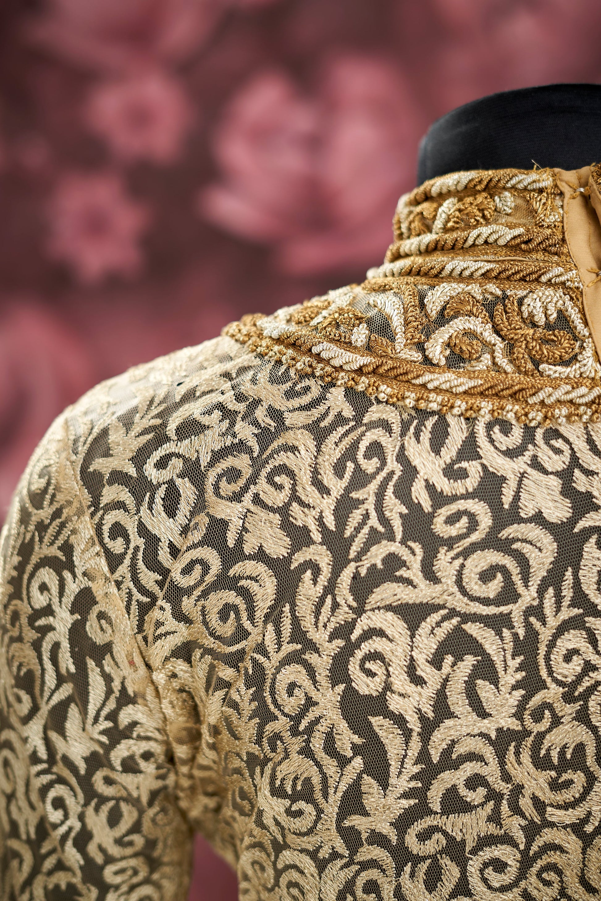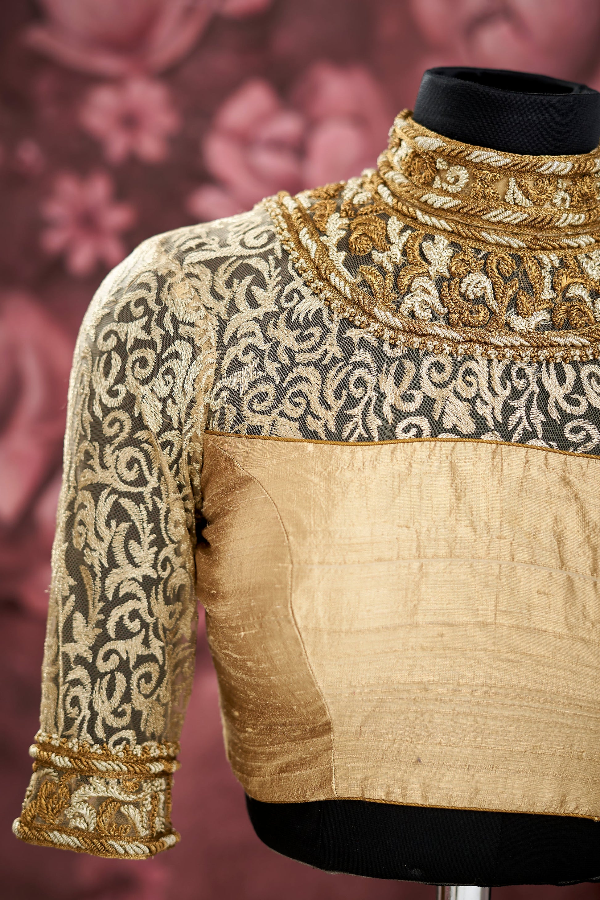 Description : Gold net Pure Raw silk bridal wear collection hand crafted Blouse, embedded with Light Gold Zari and Dark Gold Zari.