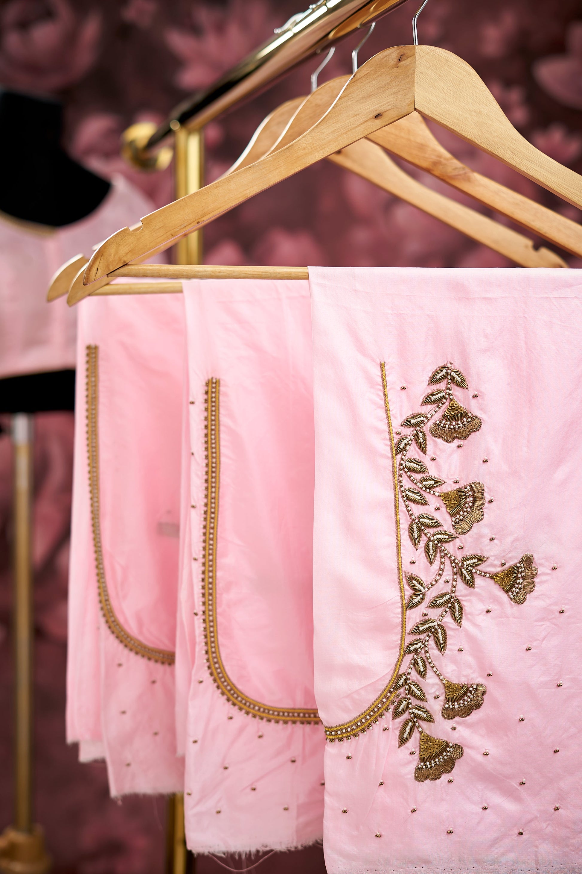 Description : Baby pink Pure Soft silk Unstitched fabric with hand crafted embroidery contains of Pearls, Gold Beads, Gold Zari and Zardosi.