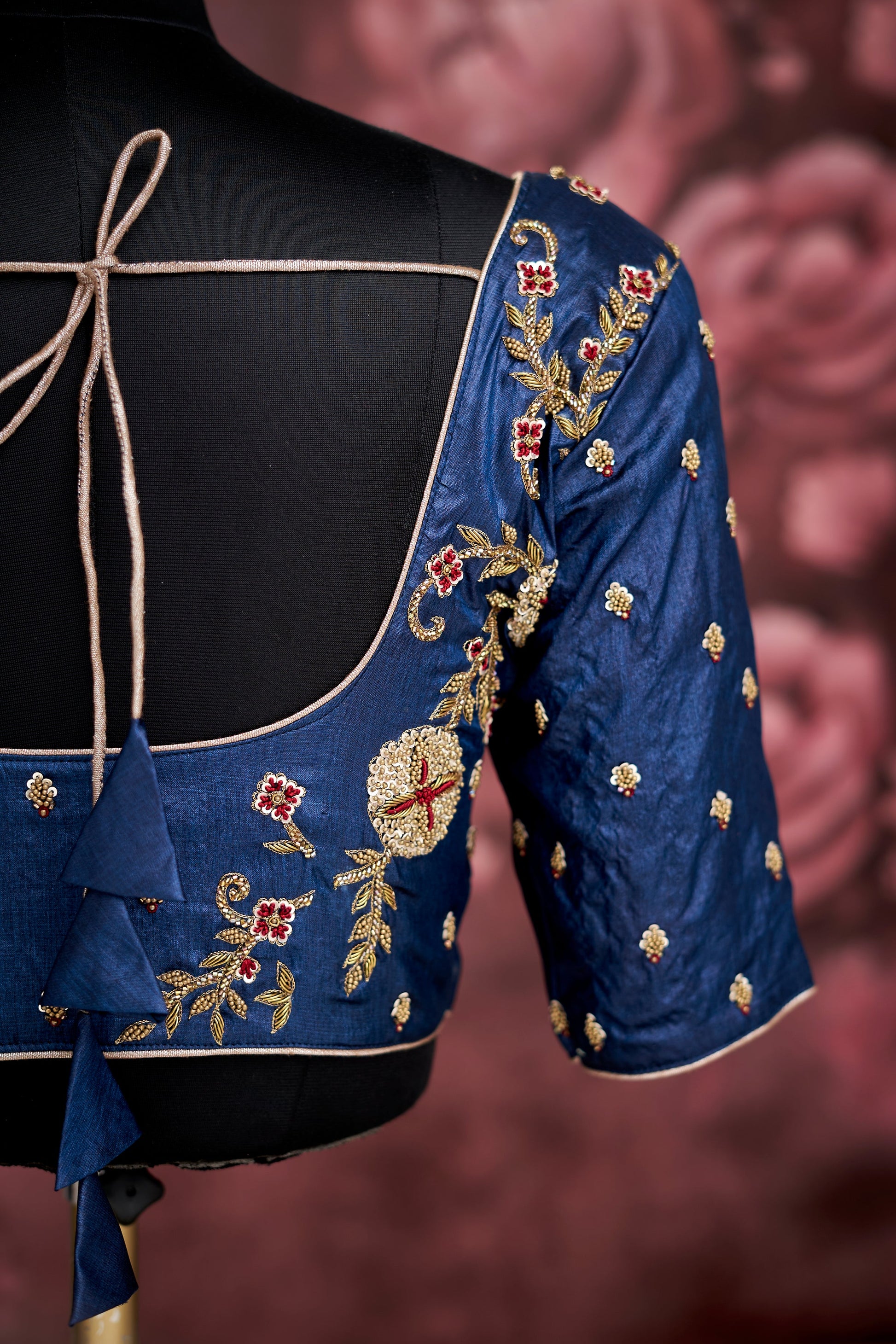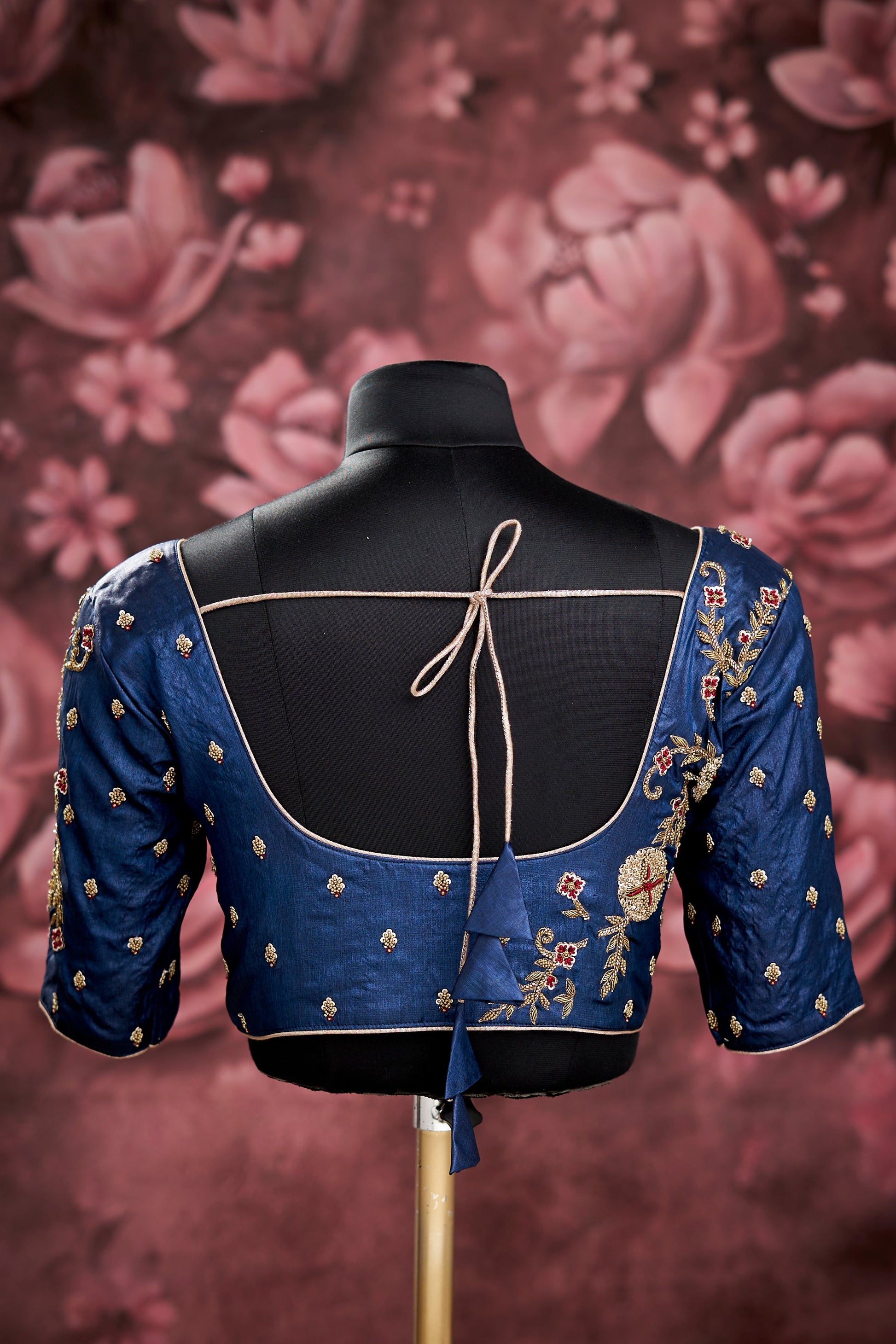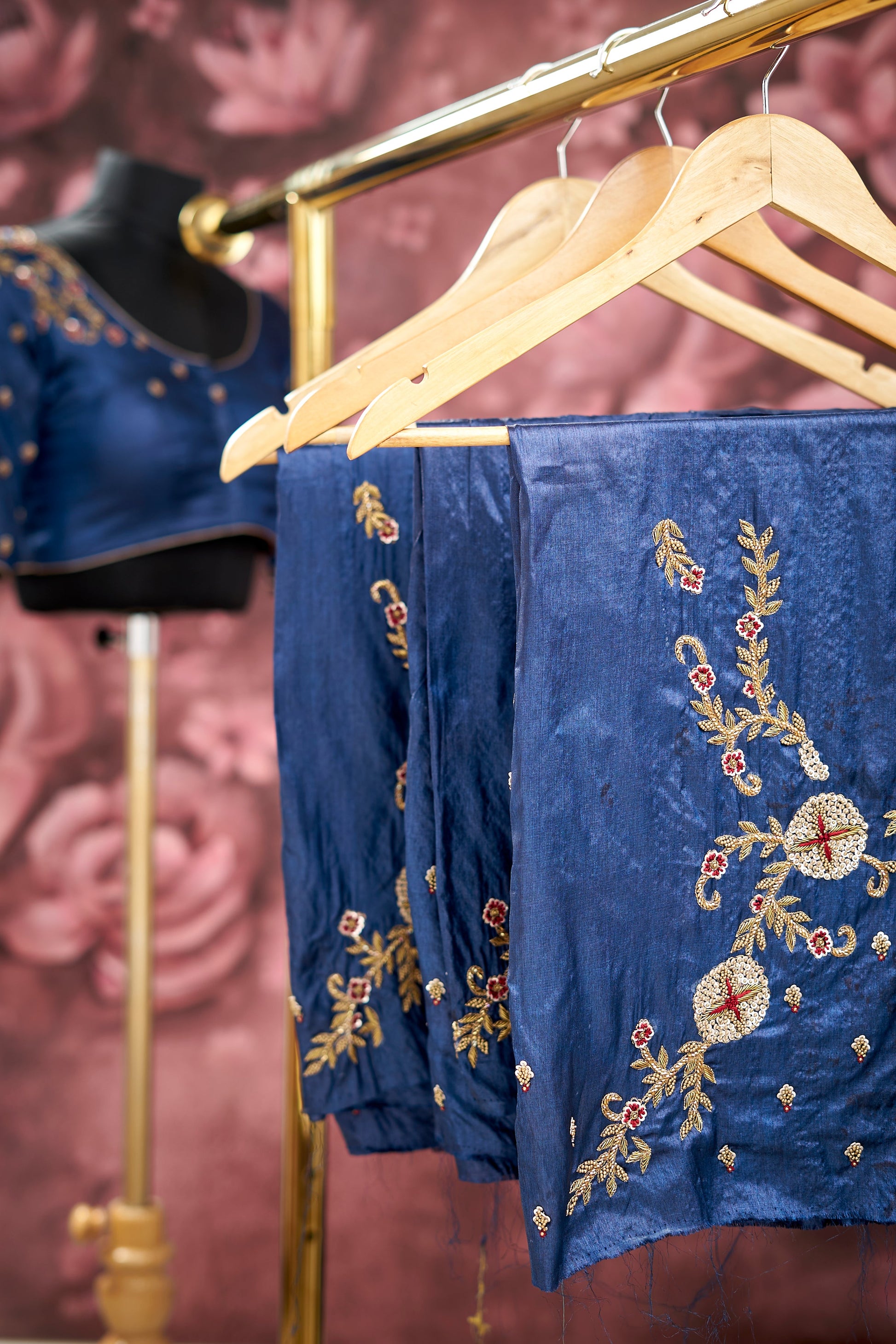 Description : Navy Blue Pure Tusser Silk Unstitched fabric, with hand crafted embroidery contains of Gold Beads, Zardosi, Chumki, Gold Zari and Silk thread.