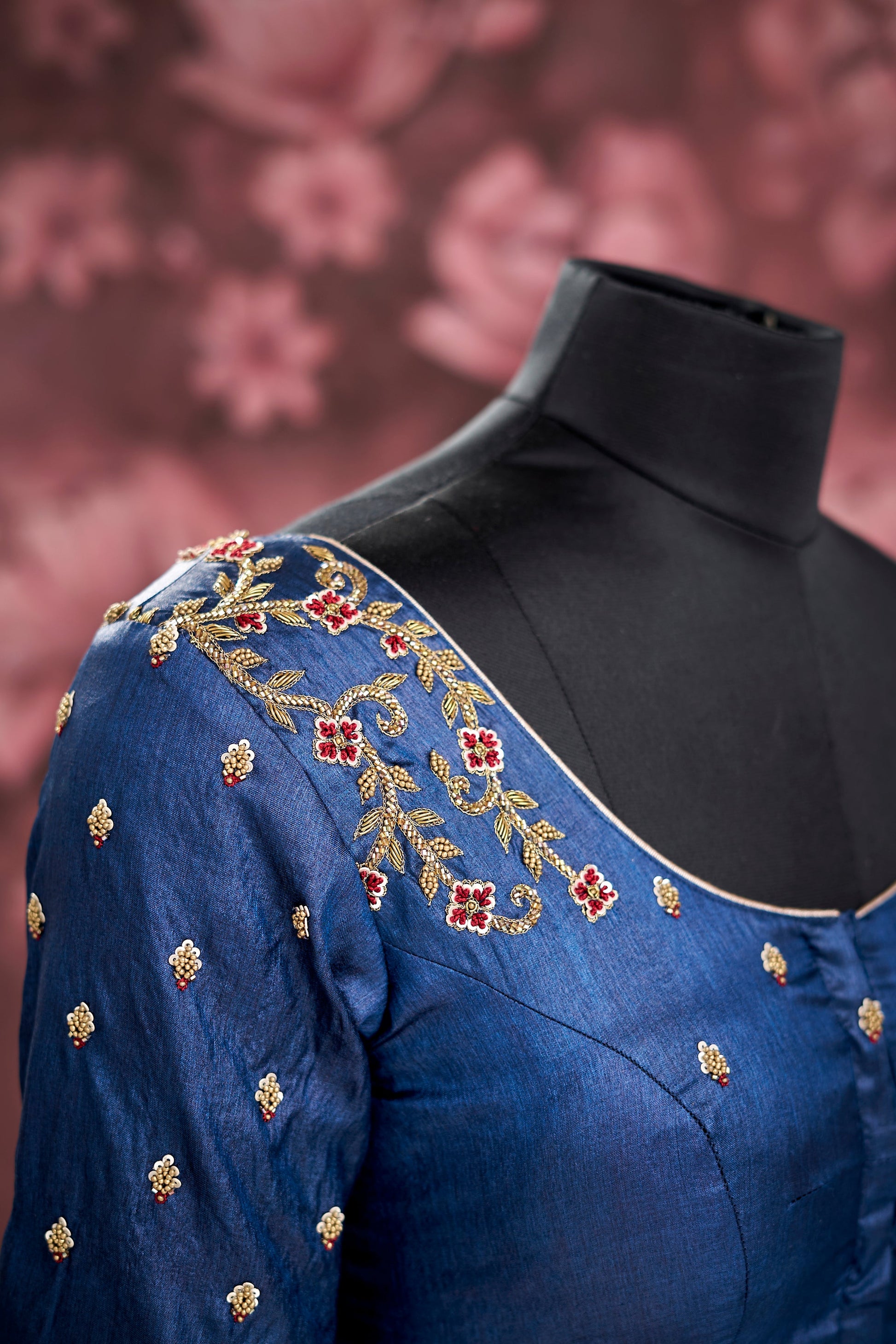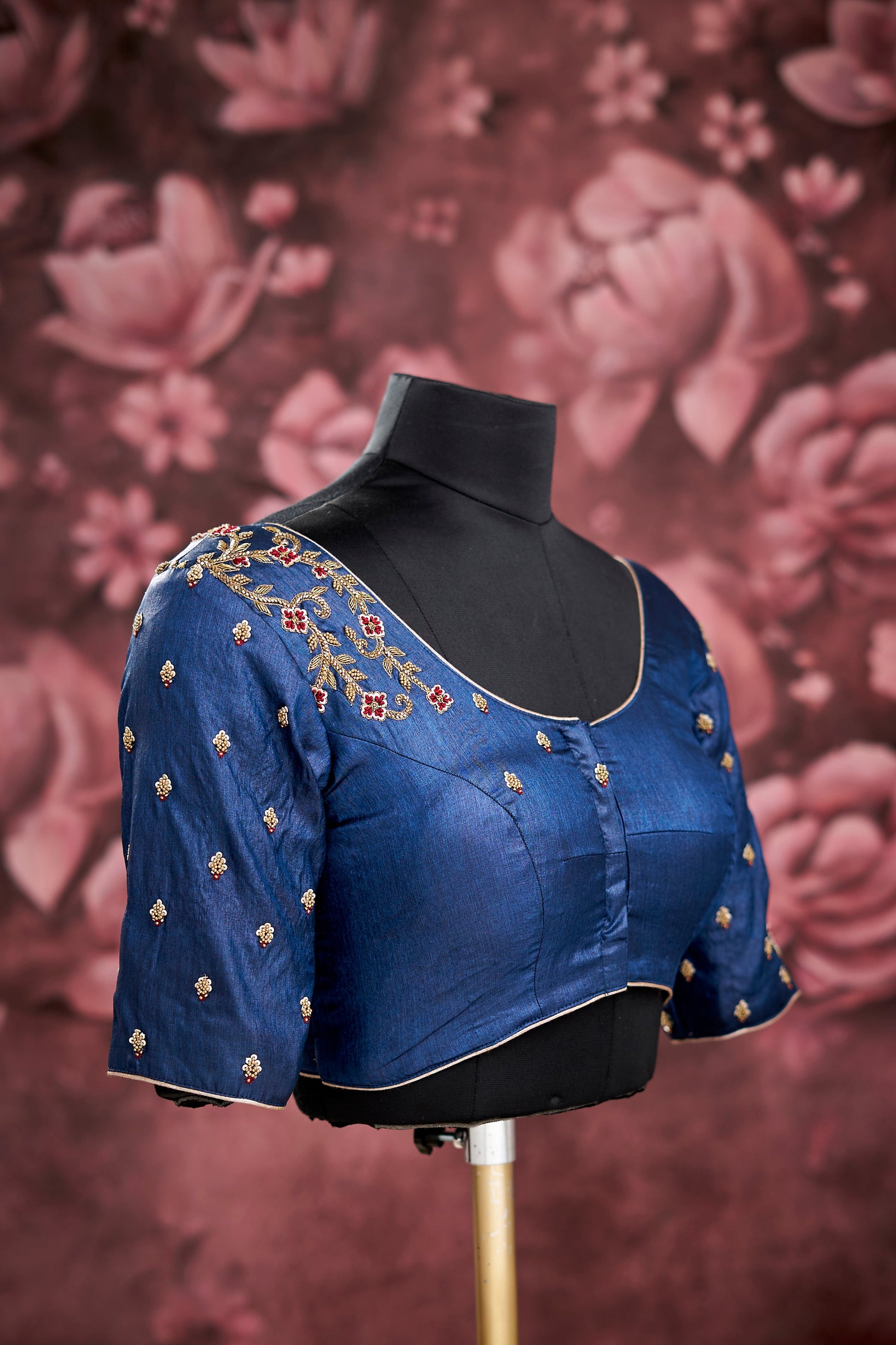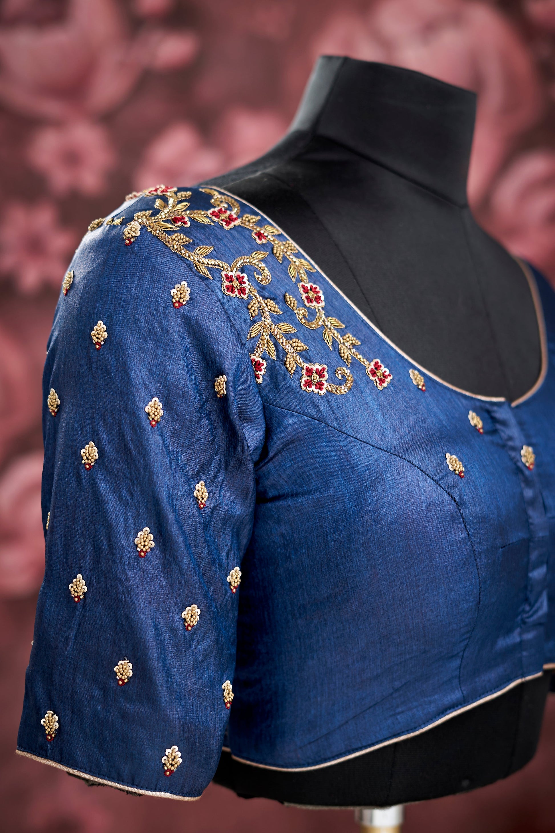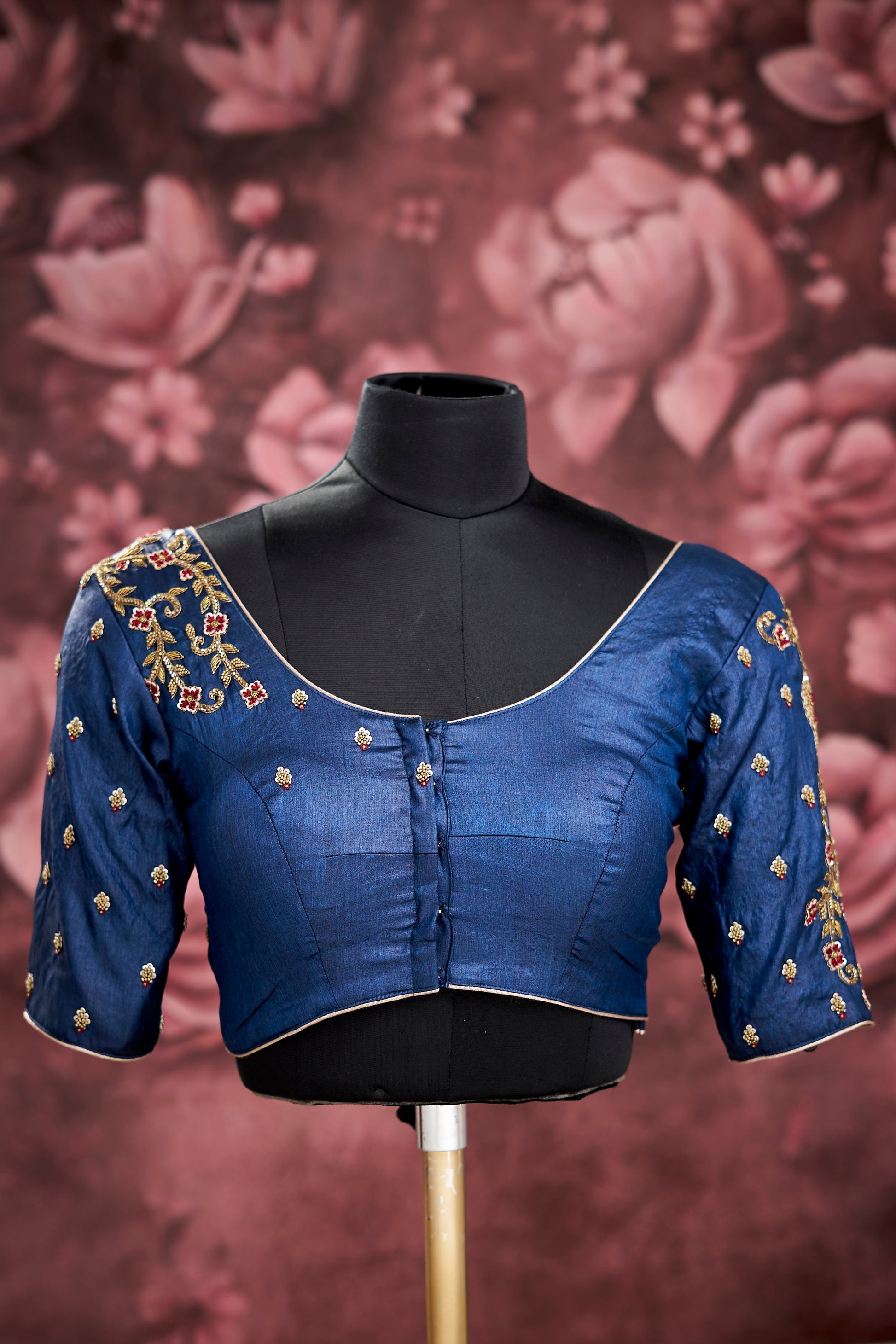 Description : Navy Blue Pure Tusser Silk Unstitched fabric, with hand crafted embroidery contains of Gold Beads, Zardosi, Chumki, Gold Zari and Silk thread.