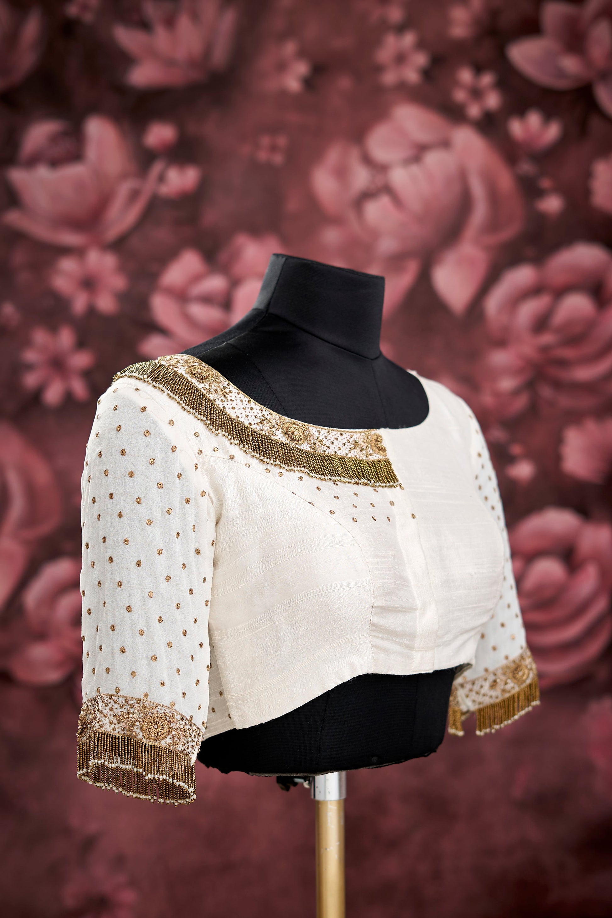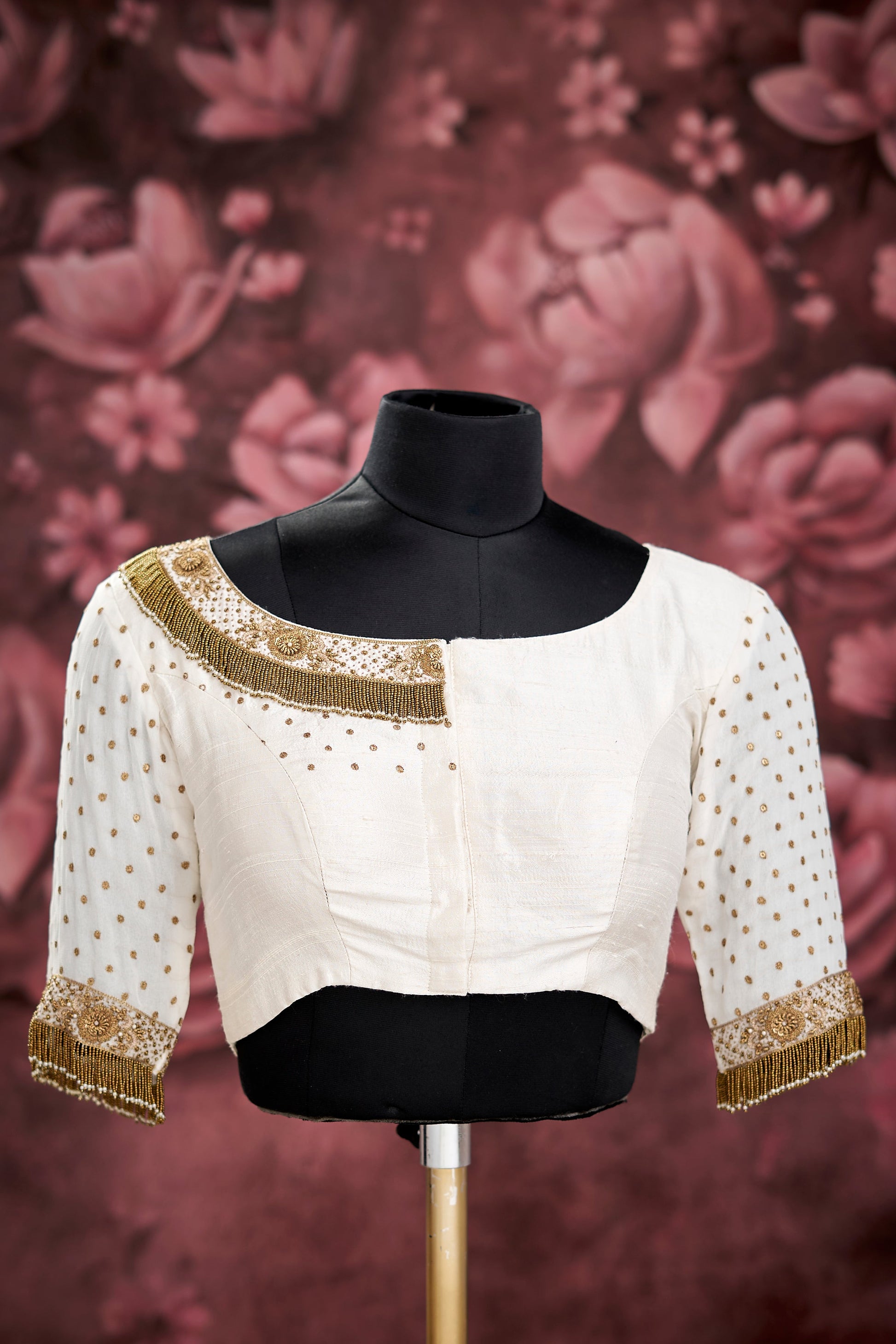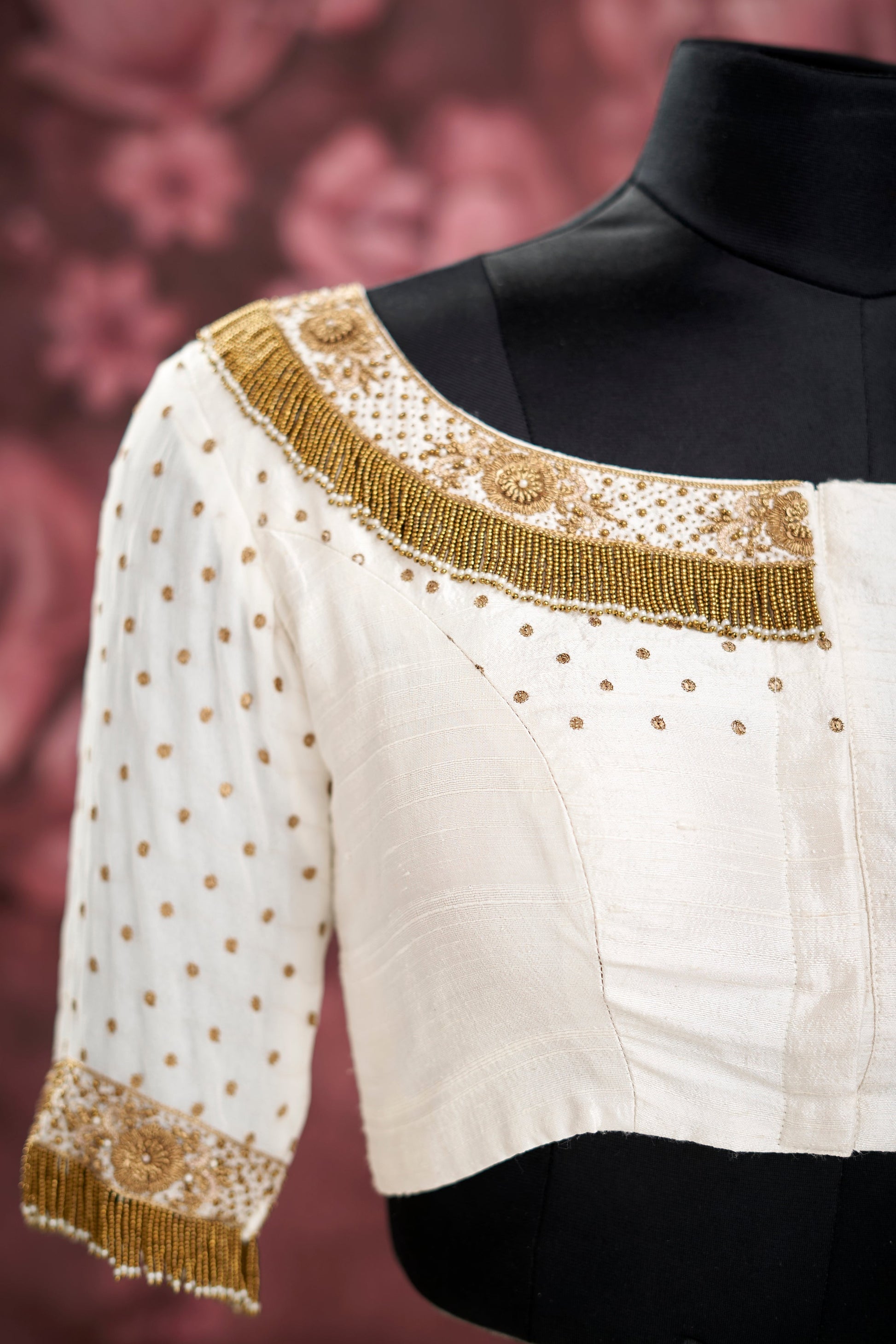 Description : Off White Pure Raw silk bridal wear collection hand crafted Blouse, embedded with Pearls, Gold Beads, Gold Zari and Chumki.
