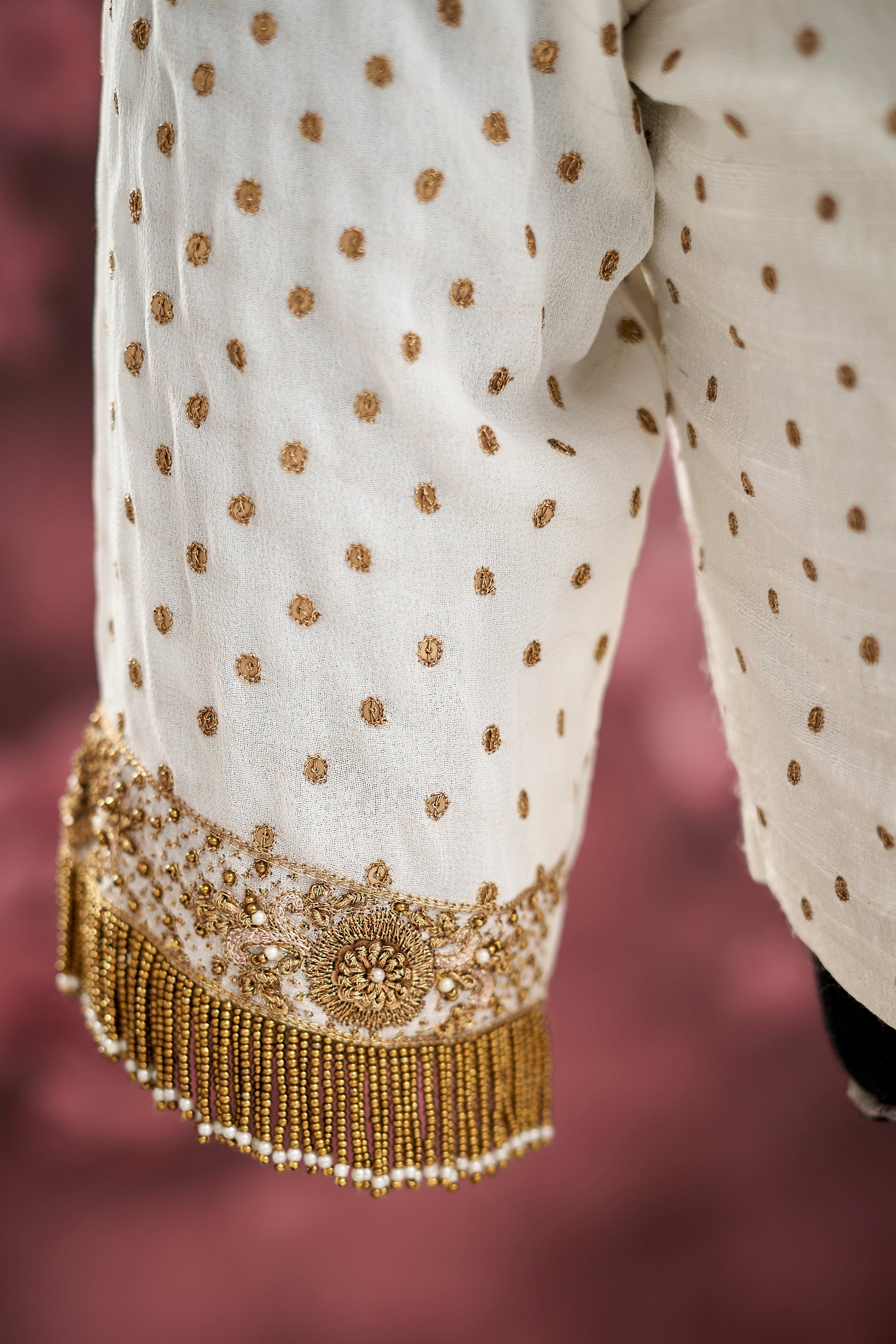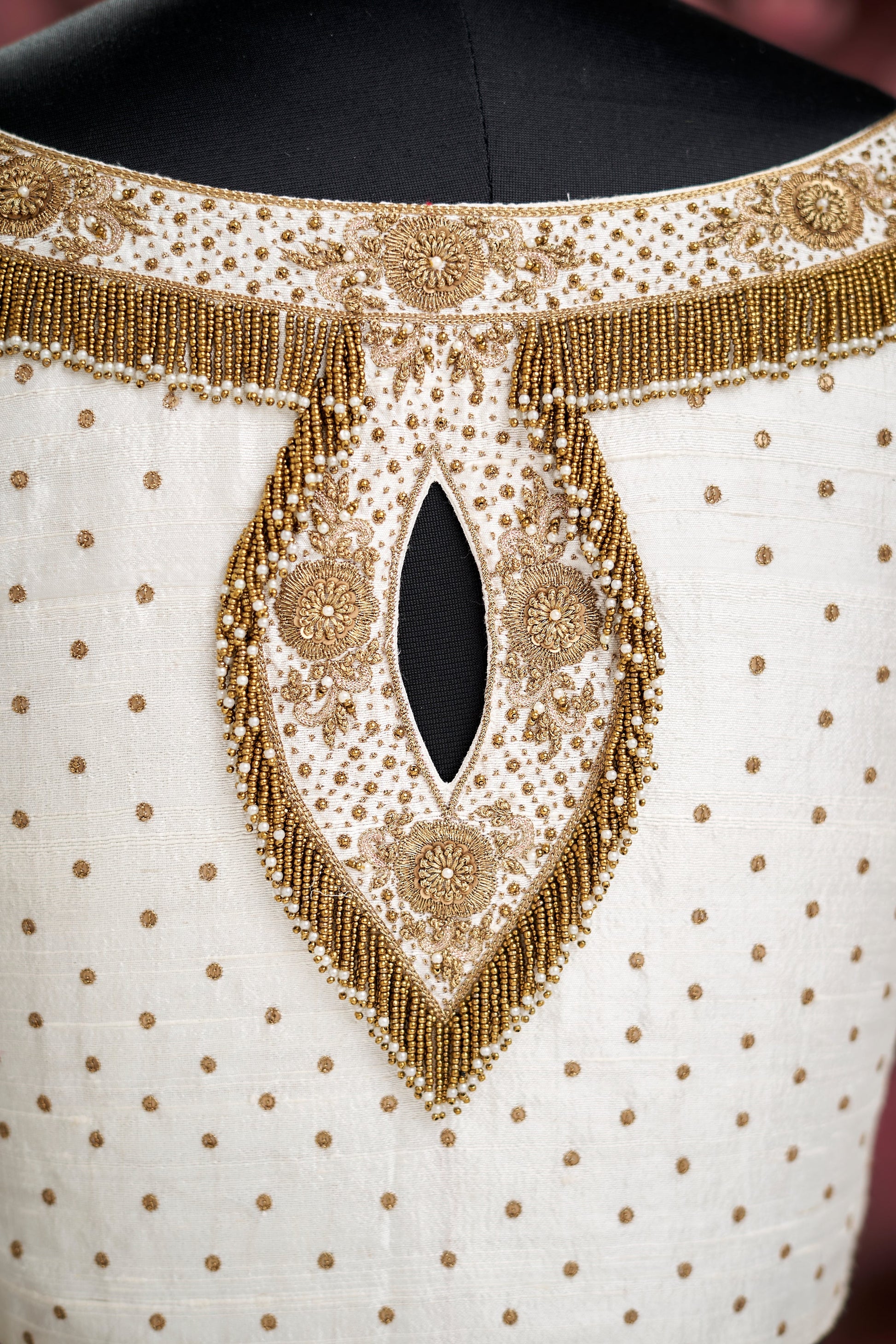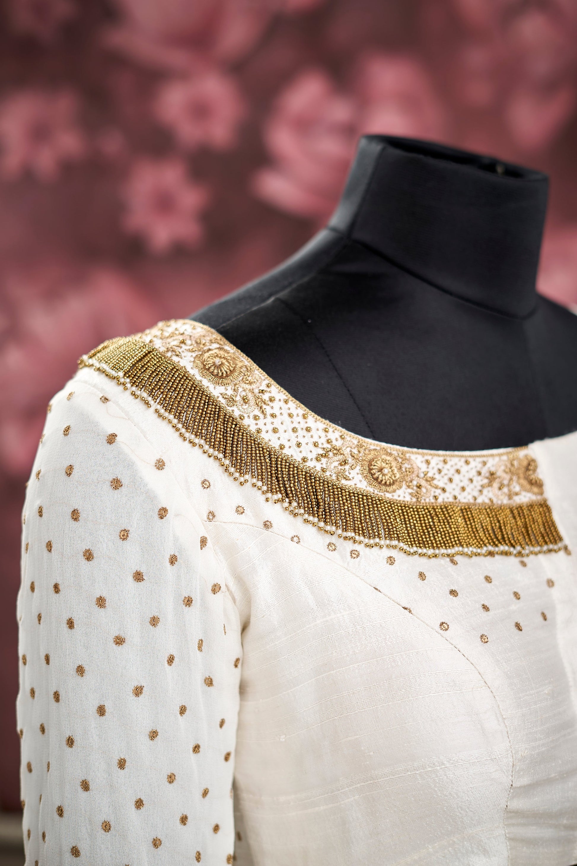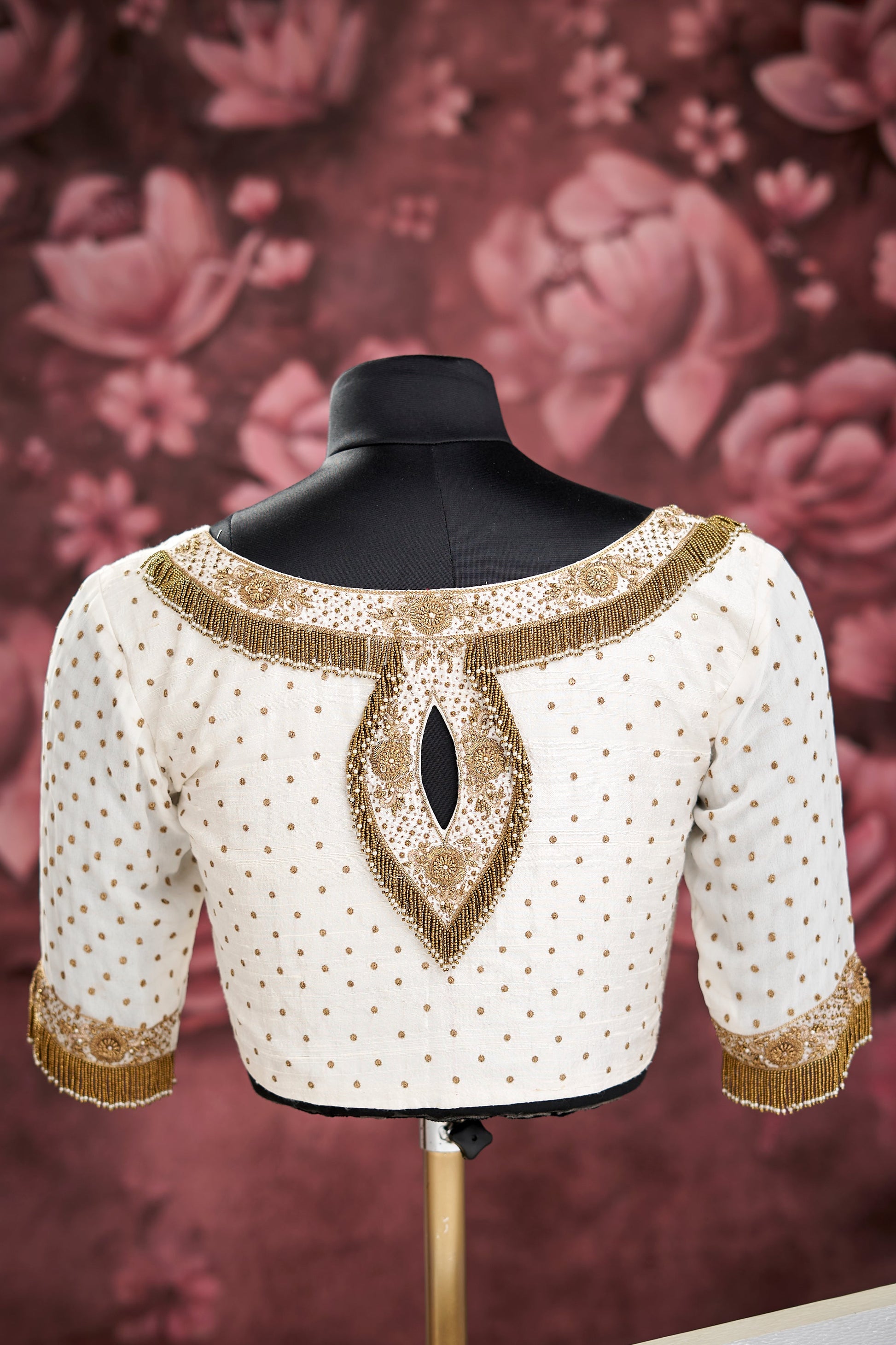 Description : Off White Pure Raw silk bridal wear collection hand crafted Blouse, embedded with Pearls, Gold Beads, Gold Zari and Chumki.