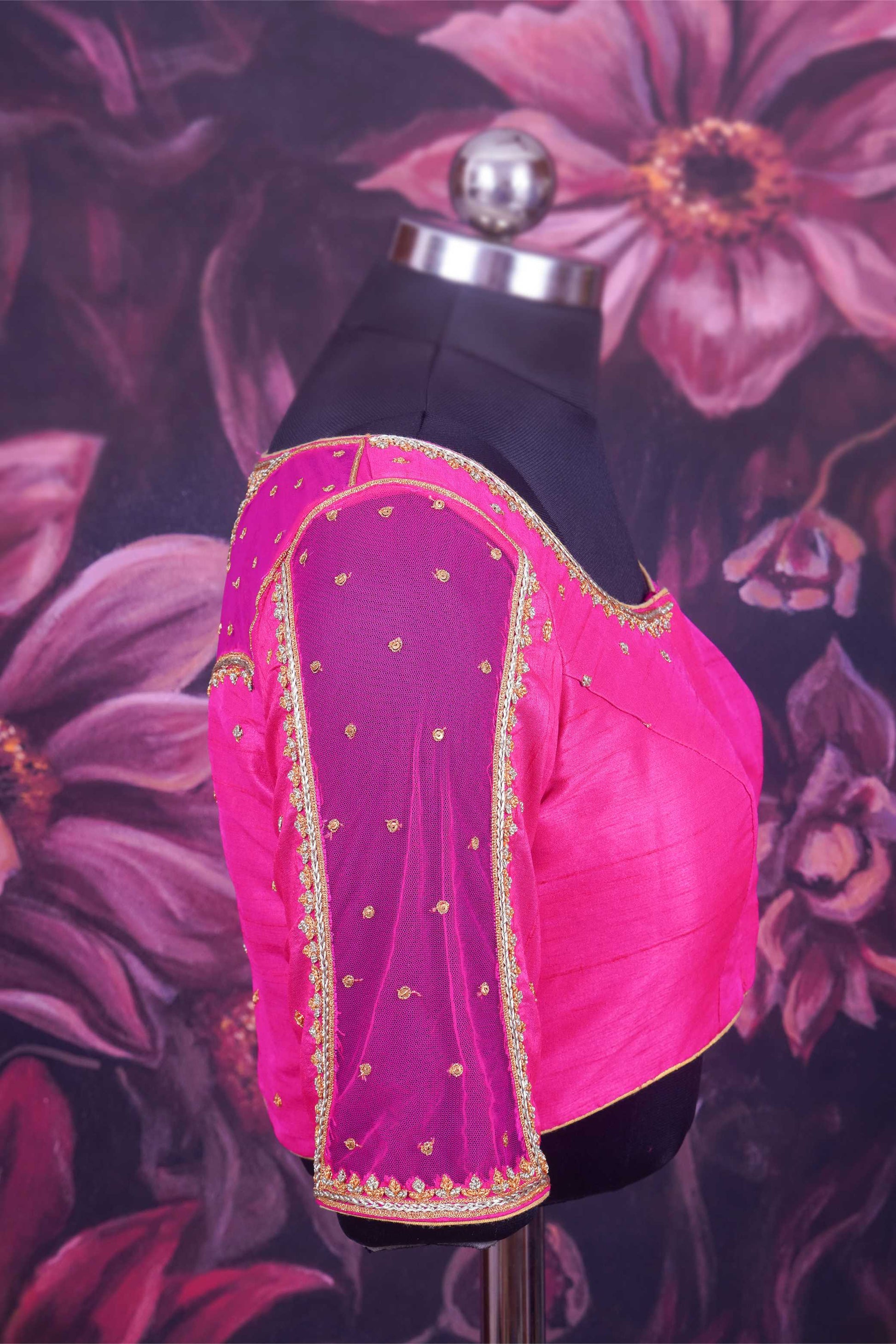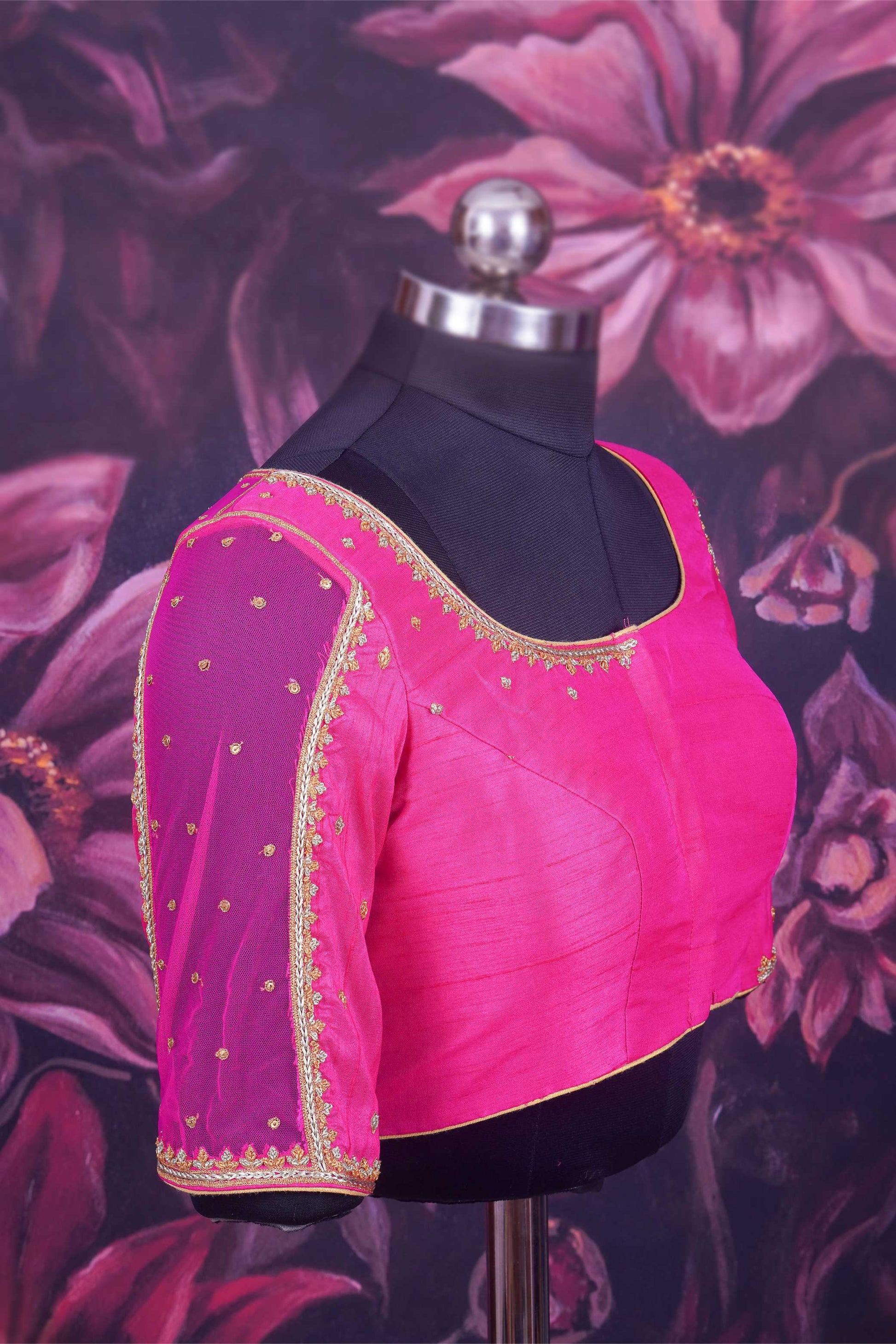 Description : Pink Raw Silk, Net Patch work, Simple and Elegant Hand Embroidery Blouse, embedded with Gold Zari. Every blouse is customized to compliment your special day.