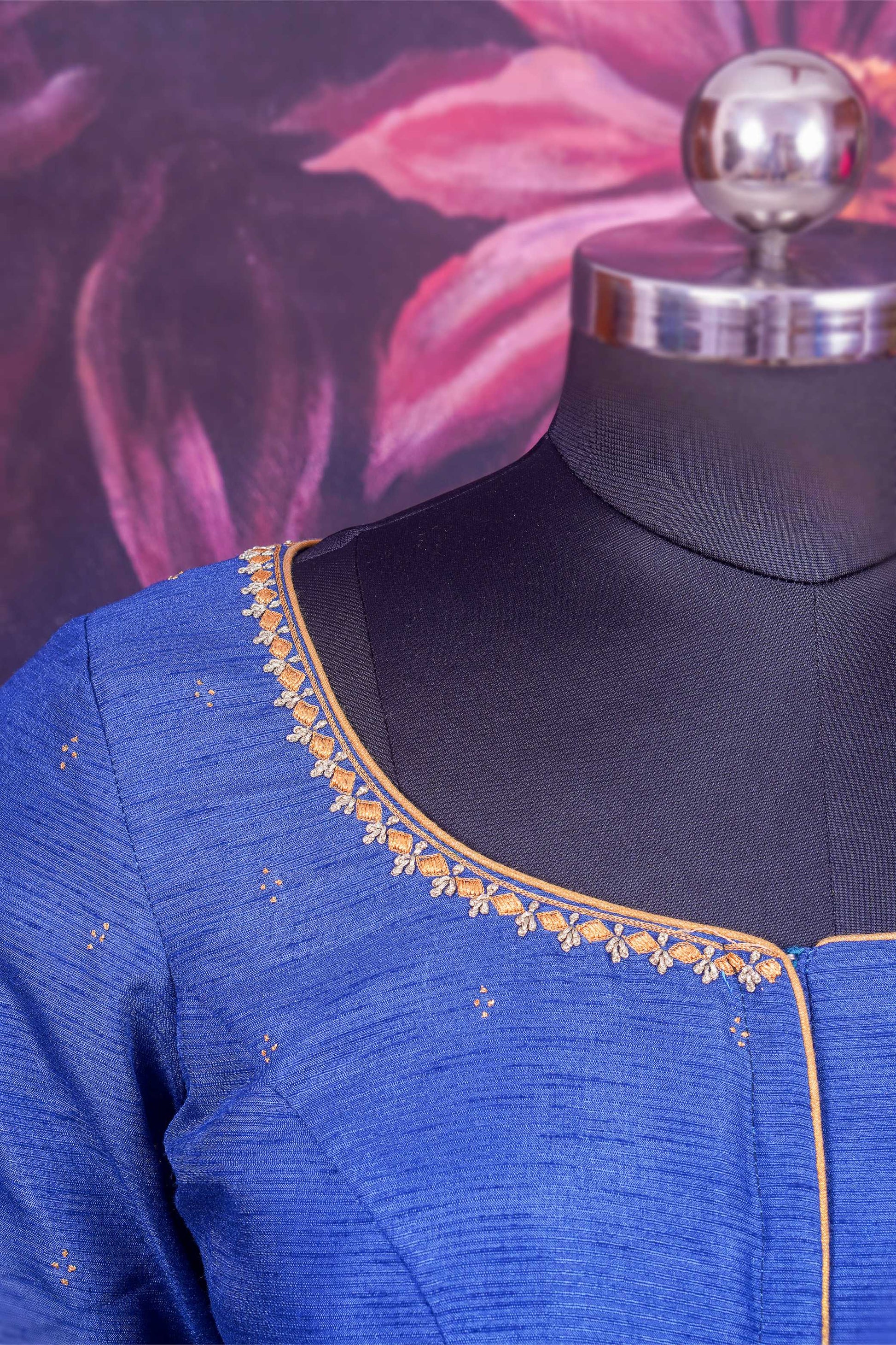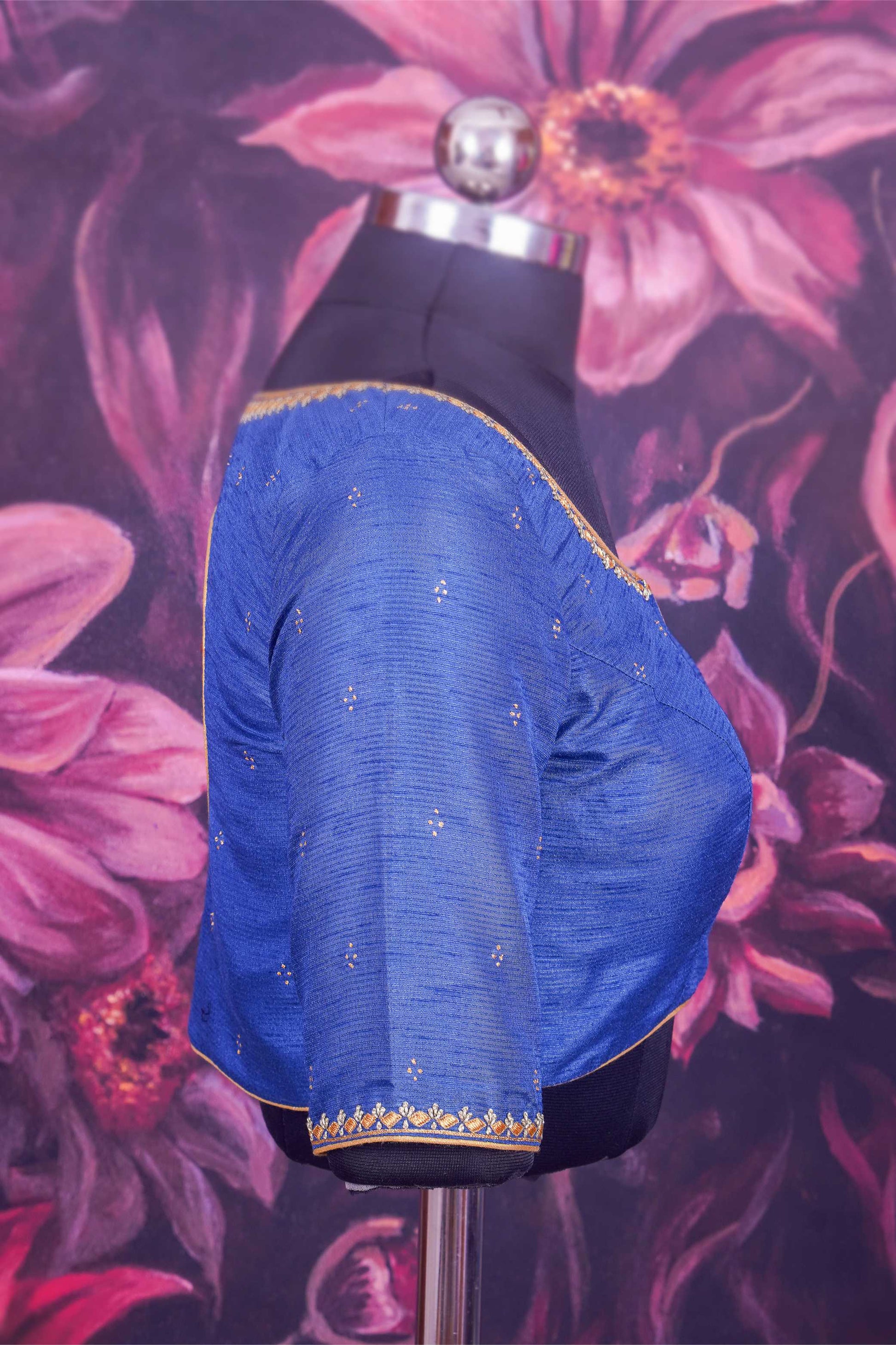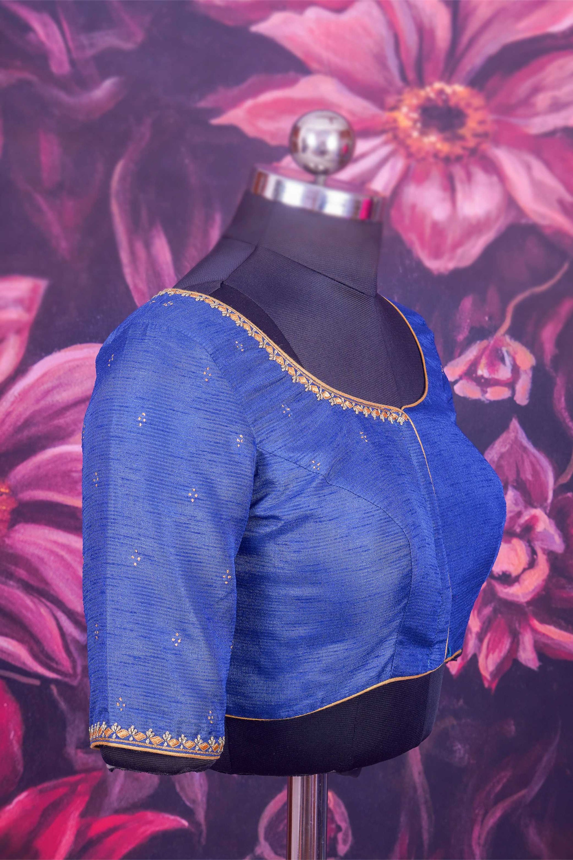 Description : Royal Blue Raw Silk, Simple and Elegant Hand Embroidery Blouse, embedded with Gold Zari. Every blouse is customized to compliment your special day.