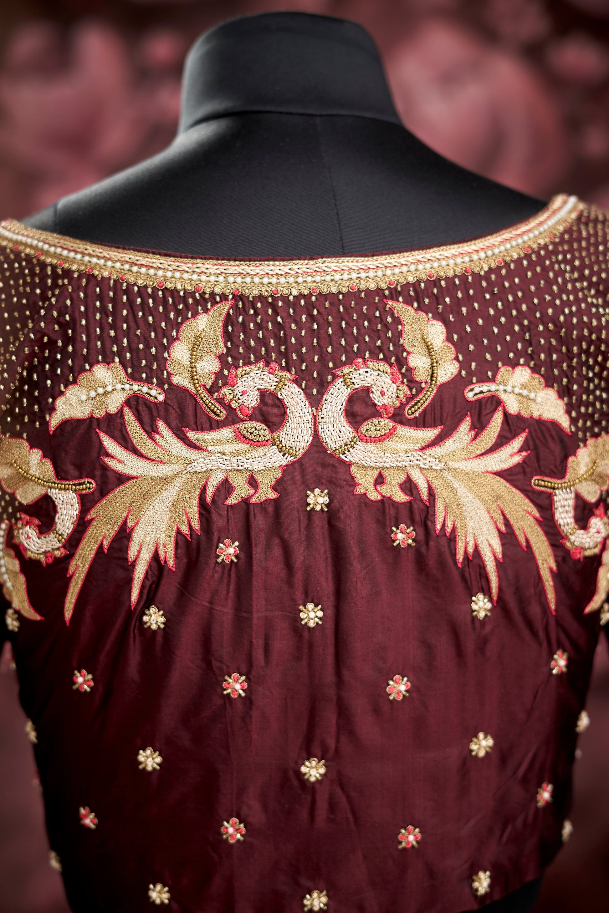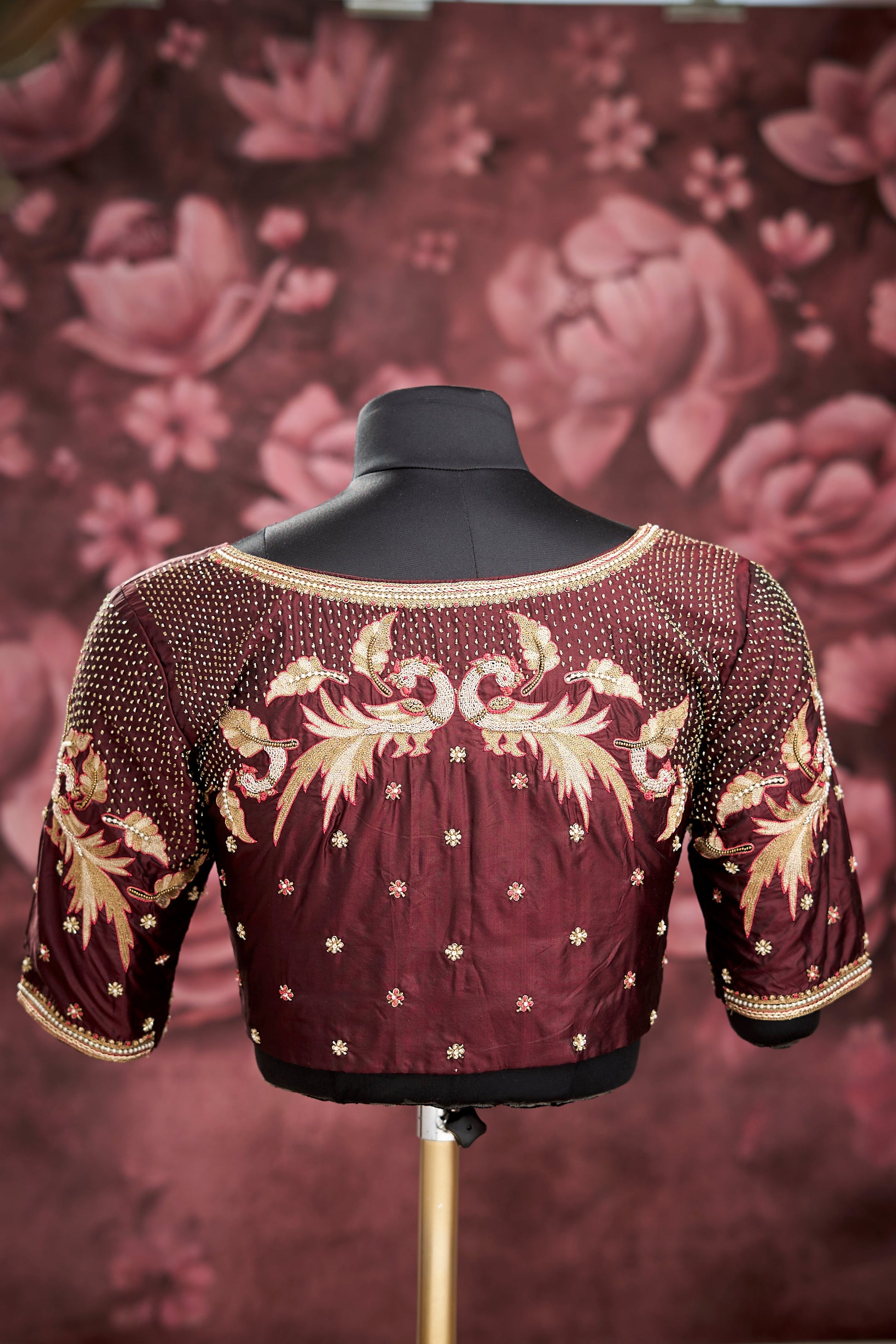 Description : Wine Pure Soft silk bridal wear collection hand crafted Blouse, embedded with Light Gold Zari, Dark Gold Zari Silk Thread, pearls, Kardhana and Gold Beads.