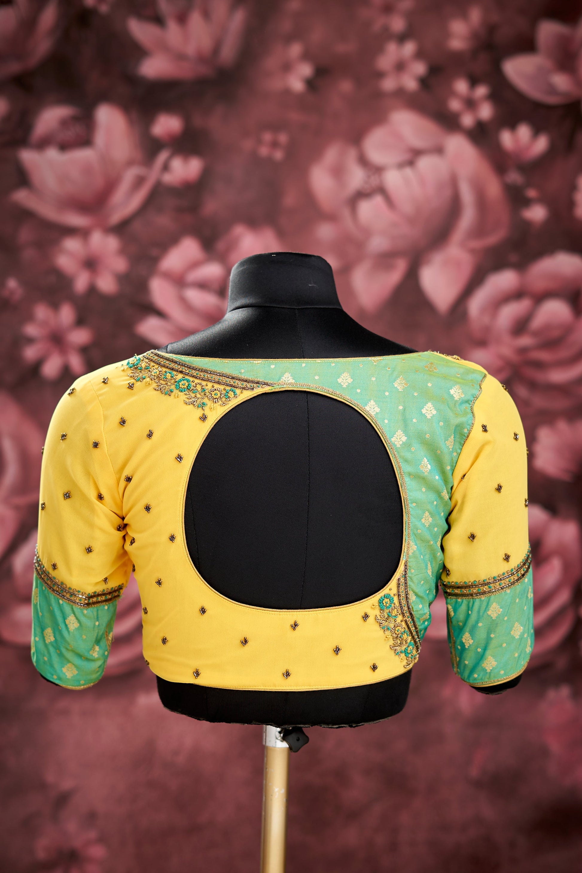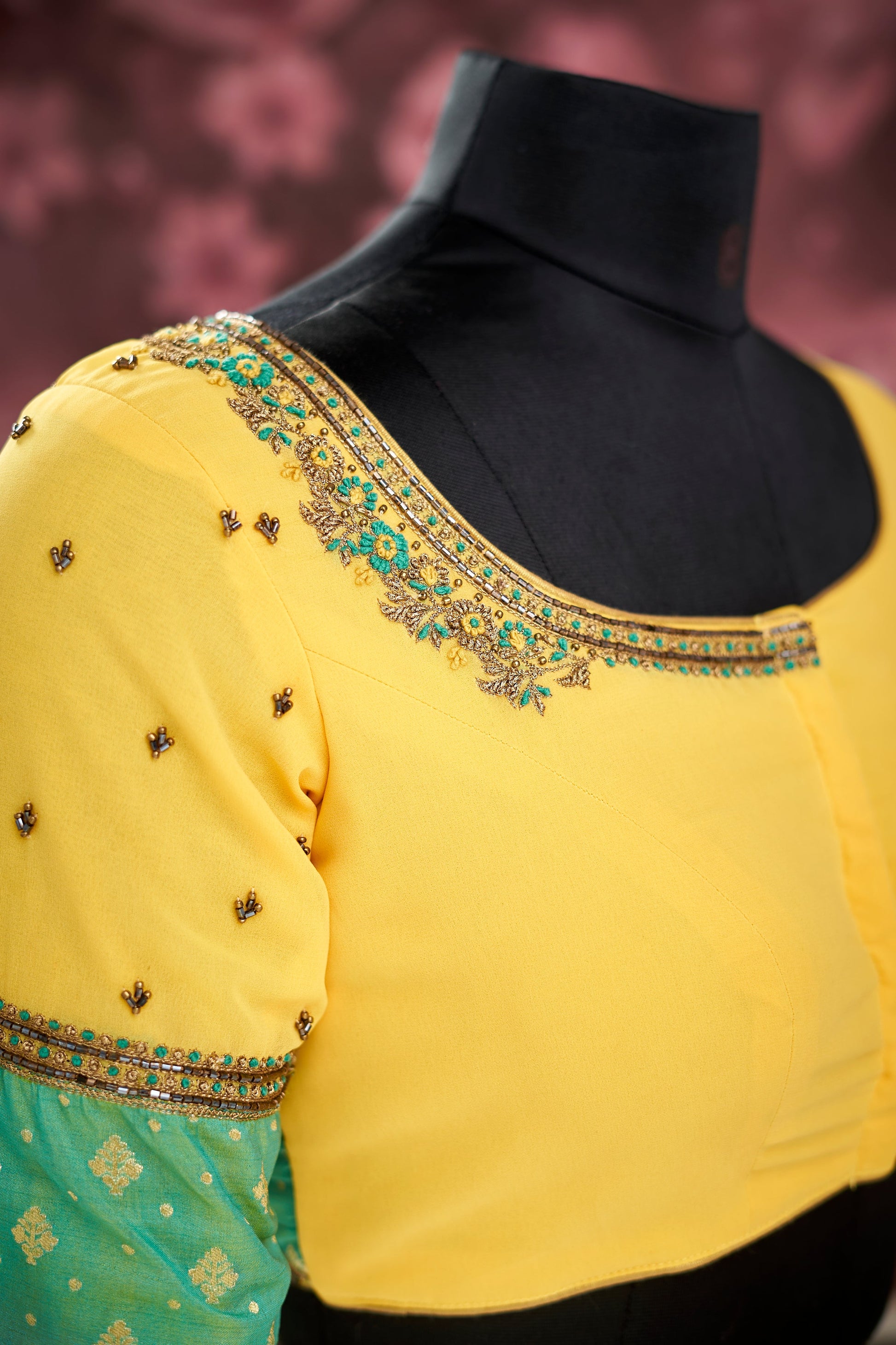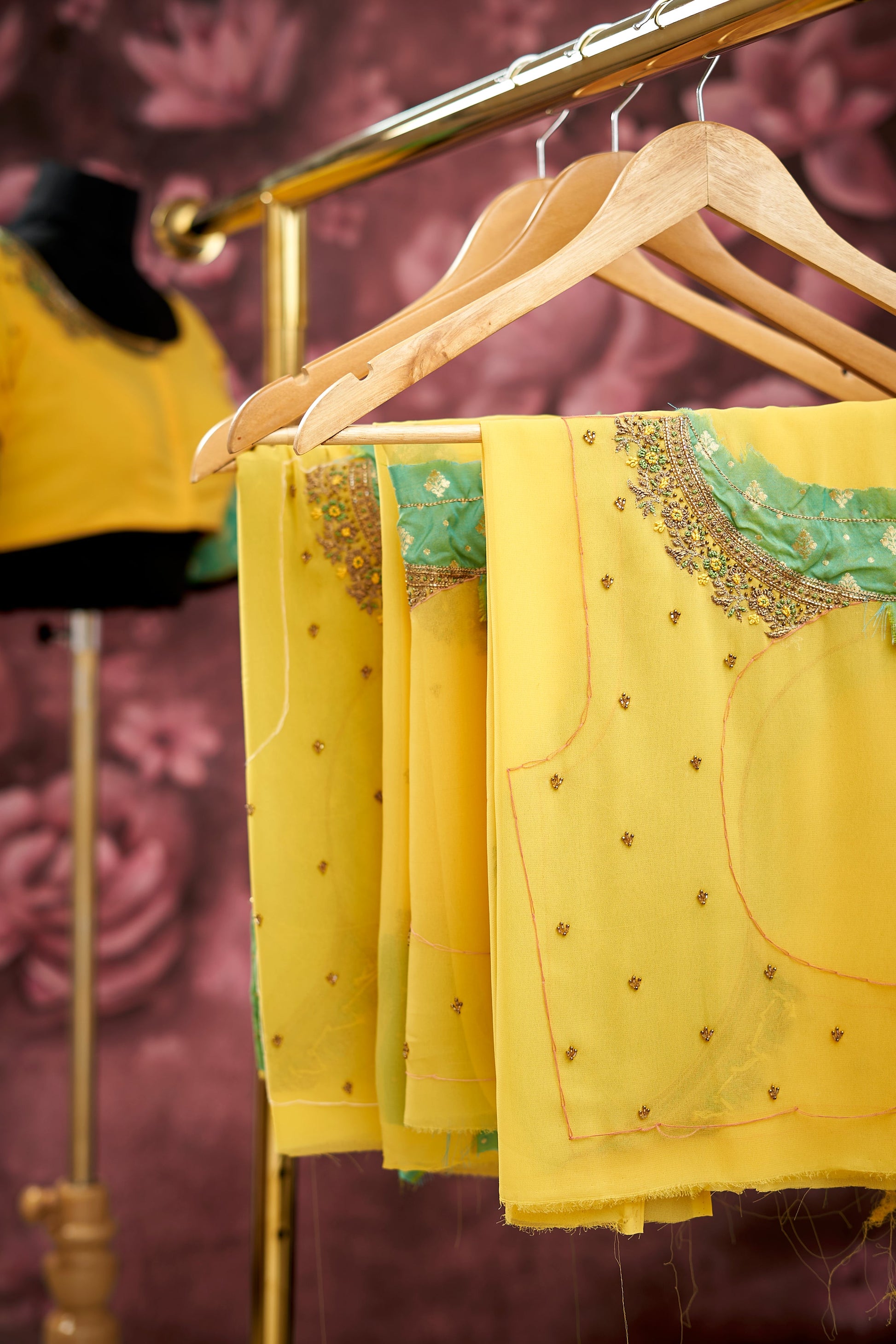Description : Yellow and Green Georgette and Brocade Unstitched fabric, with hand crafted embroidery contains of Gold Beads, Kardhana, Gold Zari and Silk Thread.